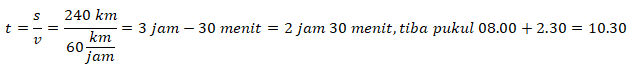 2. Jarak kota A ke kota B 240 km. Sebuah bus berangkat dari kota A pukul-08.00. Bus itu beristirahat di perjalanan selama 30 menit. Jika bus tersebut melaju dengan kecepatan rata-rata 60 km/jam, pukul berapa bus akan tiba di kota B?